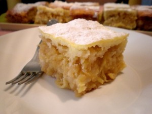 Ohladiti i rezati na kocke. No, teško da ćete to moći dočekati jer se kuhinjom za vrijeme pečenja širi predivan, neodoljiv miris jabuka i vanilije pa ćete na kolač navaliti i prije nego se ohladi. Samo naprijed. Jednako je ukusan topao i hladan. Pazite samo da ne opečete jezik i nepce.