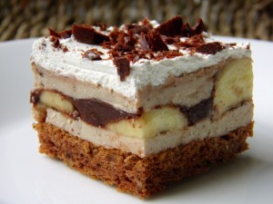 - Na ohlađeni biskvit koji ste prethodno zalili sa 1,5 dl mlijeka s rumom, premazati polovicu kreme, složiti po njoj banane prerezane po dužini, pa zatim prostor između banana popuniti otopljenom čokoladom. Staviti kolač na 20 min u hladnjak kako bi se čokolada stvrdnula. Tada premazati ostatkom kreme od kestena i na kraju sve premazati tučenim vrhnjem za šlag. Po želji ukrasiti čokoladnim strugotinama.
